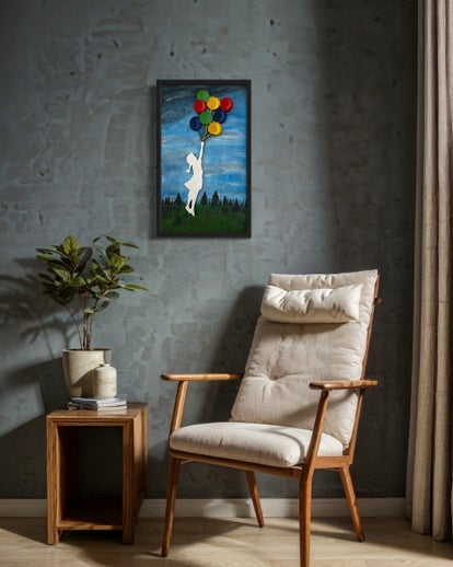 Fliegendes Mädchen mit bunten Luftballons