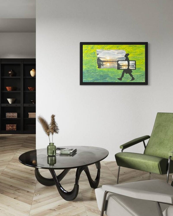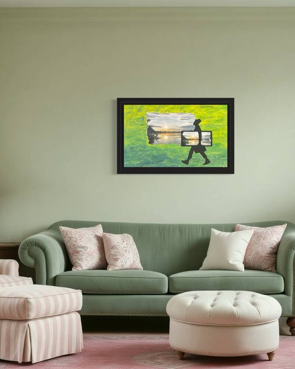 Clochard mit Bilderrahmen unterwegs in den Sonnenuntergang